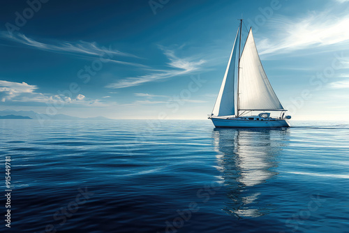 Obraz premium Serenity at Sea: A Sailboat's Journey on a Calm, Reflective Ocean