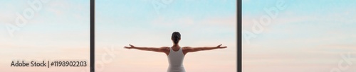 © Ryzhkov, Obraz premium Serenity at Sunset Woman Stretching by Office Windows
