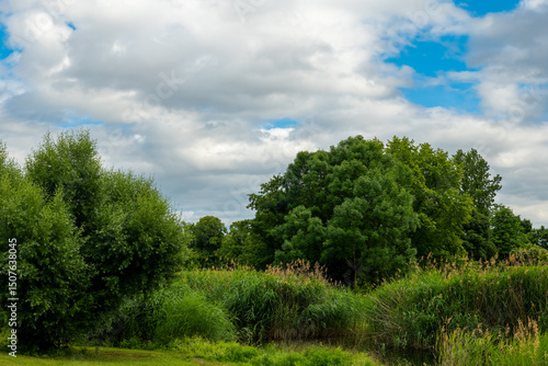 Fototapeta premium Serenity found in a lush green landscape by a tranquil waterway under a cloudy sky