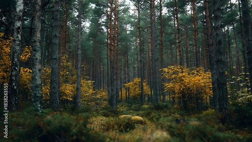 © RAKSIWAH, Naklejka premium Serenity in a Dark Green Pine Thicket in Latvia’s Verdant Forests