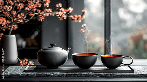 © aviavlad, Obraz premium Serenity in a teapot moment with warm cups and blooming branches