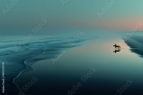 © D, Naklejka premium Serenity of a Misty Beach with Lone Horse at Dawn - Tranquil Landscape for Calmness and Reflection