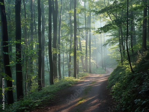 Obraz premium Serenity, quiet forest path, morning mist, dappled sunlight, serene walk, natures embrace