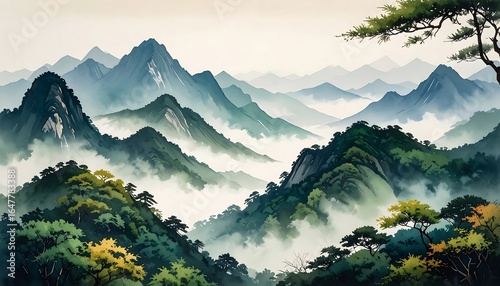 © Dani, Obraz premium Serenity unfolds in a majestic mountain range, with lush forests embraced by gentle mist and