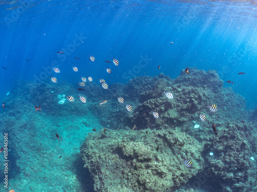 © d3_plus, Obraz premium 水面を泳ぐ 可愛いオヤビッチャ(スズメダイ科)他の幼魚の群れ 英名学名:Sergeant Major (Abudefduf vaigiensis) 静岡県伊豆半島賀茂郡南伊豆町中木ヒリゾ浜2024年