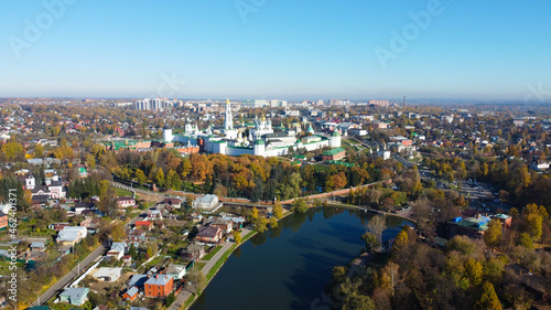 Fototapeta premium Sergiev Posad, Russia - 08 October 2021: Autumn view of the Holy Trinity Lavra of St. Sergius from a bird's eye view