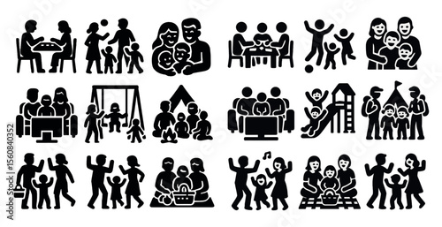 Fototapeta premium Series of black and white icons depicting various family activities. The icons include a family sitting around a table, a family playing in a park, and a family enjoying a meal together