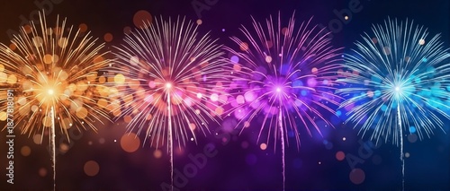 © olgadanilina, Fototapeta premium Series of fireworks are lit up in the sky, creating a colorful