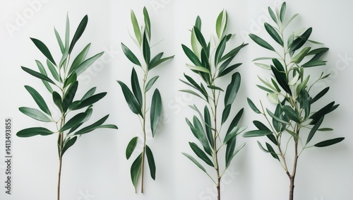 © AIArtistry, Naklejka premium Series of green olive branch pictures isolated against white