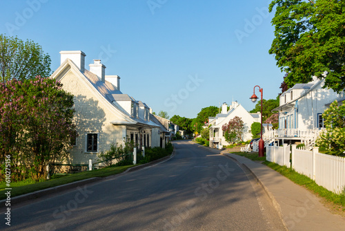 © Anne Richard, Fototapeta premium Series of old mid-19th century houses along the Chemin Royal in the quaint village of St-Jean in the spring, Island of Orleans, Quebec, Canada