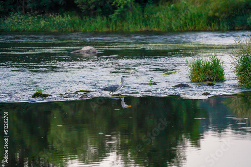 © helfei, Fototapeta premium Series shot of a Gray Heron on the Black Rain River catching a fish and eating at dusk