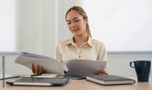 © wattana, Fototapeta premium Serious businesswoman sitting in front of laptop computer at her workplace and reading financial reports..