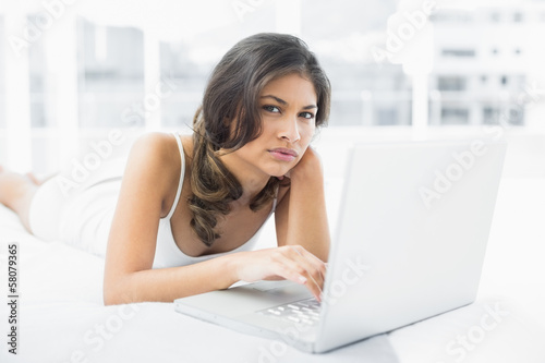 © lightwavemedia, Naklejka premium Serious casual woman using laptop in bed