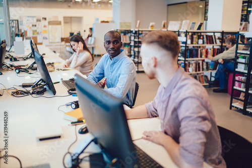 Obraz premium Serious friends communicating in library