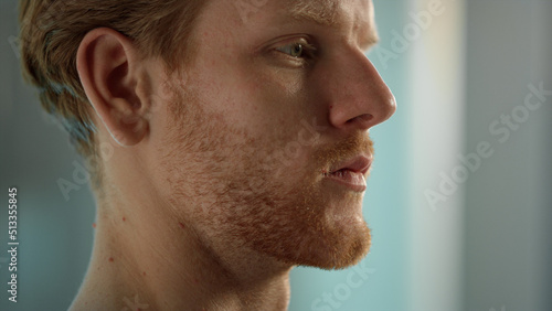 Obraz premium Serious man face expression closeup. Tired ginger worker resting after hard day