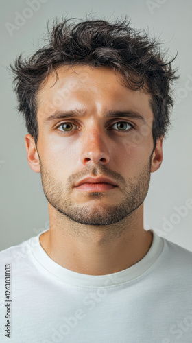 © Dari, Fototapeta premium Serious Man Portrait, Intense Gaze, White T-shirt, Indoor