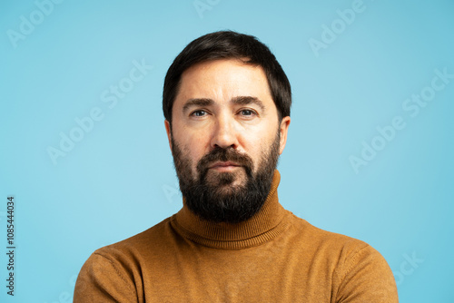 Fototapeta premium Serious man with beard and turtleneck posing on blue background