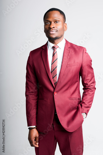 © DmitryStock, Fototapeta premium Serious manager from nigeria in suit with hand in pocket looking at camera while standing on white background