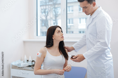 Obraz premium Serious nice doctor holding a bottle with medicine