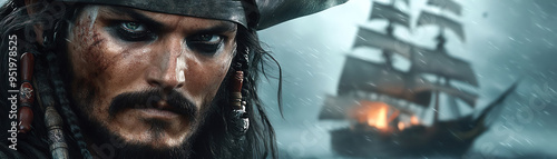 © Creative_Bringer, Obraz premium Serious pirate with a ship in the background, staring at the sea