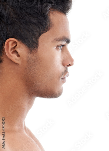 Fototapeta premium Serious profile. Profile shot of a handsome young man isolated on white.