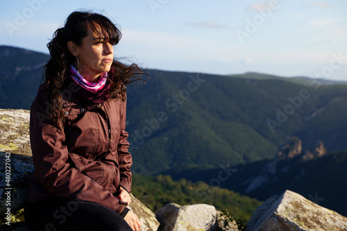 Naklejka premium Serious woman on the hill of a mountain looking the landscape