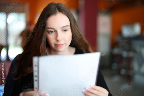 © Antonioguillem, Fototapeta premium Serious woman reading menu in a restaurant