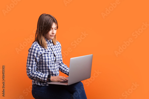 Fototapeta premium Serious woman with brown hair sitting with laptop and working remotely,...