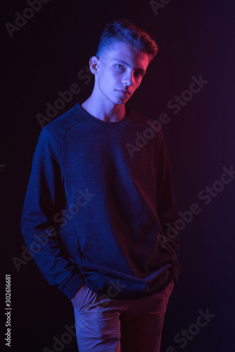 © Антон Фрунзе, Naklejka premium Serious young guy in brown sweater in neon light