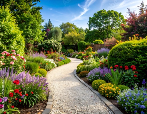 © Paypal, Fototapeta premium Serpentine gravel path meanders through a vibrant, flowering garden, showcasing diverse plants and lush greenery under a bright summer sky