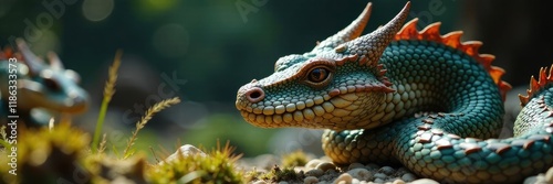 © สิริวุฒิ นาคโคตร, Fototapeta premium Serpentine horns protrude from ancient scales, prehistoric, wilderness
