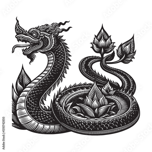 Fototapeta premium Serpentine illustration with lotus accents, mythological serpent