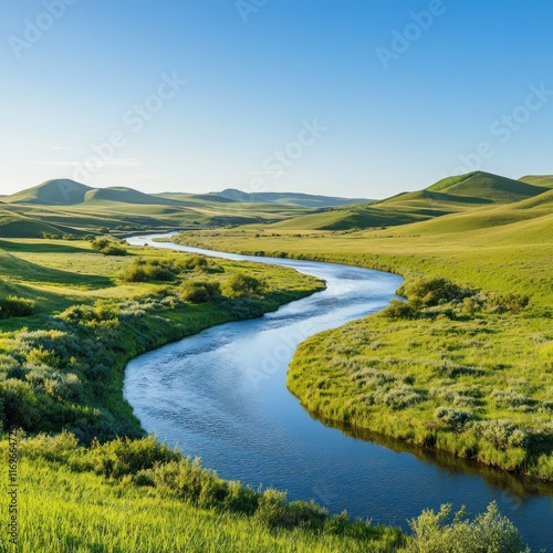 © Fenny, Obraz premium Serpentine river meandering through lush green valley under a clear blue sky.