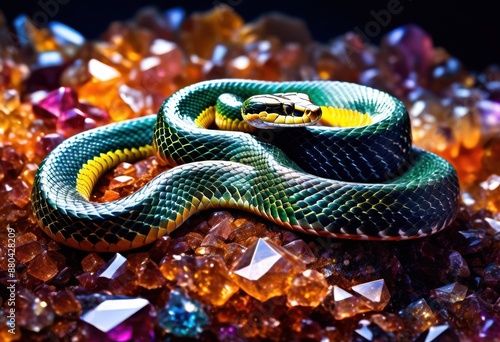 Obraz premium serpentine snake gliding across shimmering quartz crystals, slithering,...
