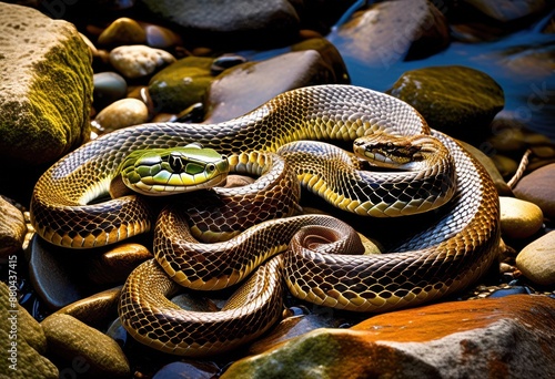 © Yaroslava, Obraz premium serpentine snake relaxing smooth river rocks reptile resting place nature scene, wildlife, habitat, stones, natural, basking, sun, colors, scales, animal