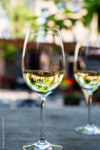 © Maksim Shebeko, Obraz premium Served table set at summer terrace cafe