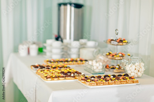© serg141073, Naklejka premium Served tables in restaurants and cafes, meals and drinks on the tables, room design.