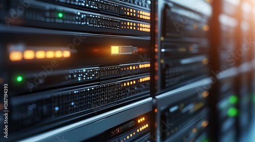 © Art Jabz, Obraz premium Server rack close-up with glowing lights in data center