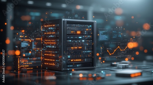 Obraz premium Server rack with data visualizations, abstract digital network environment