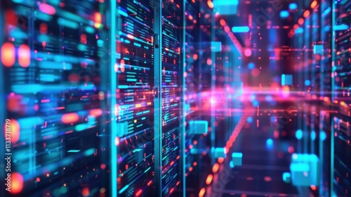Naklejka premium Server racks are flashing with activity as they process big data in a data center, representing the power and complexity of modern information technology