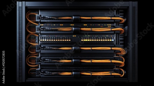Obraz premium Server racks, electric cables and wires representing fiber optic internet...