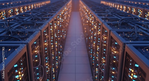 Fototapeta premium Server racks stretch into the distance, a digital information hub