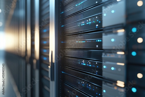 Obraz premium Server racks with glowing blue indicators in a high-security data center...