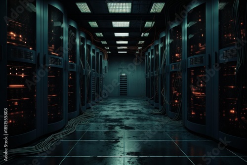 Fototapeta premium Server racks with glowing lights filling a dark data center processing information