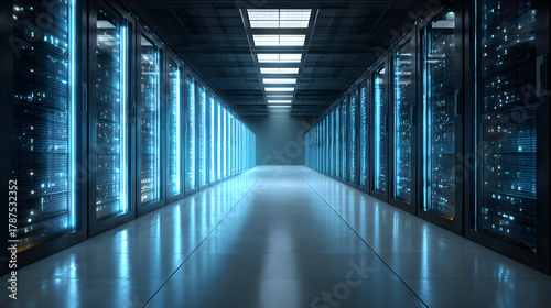 © utaem2022, Fototapeta premium Server room aisle with glowing data processing racks
