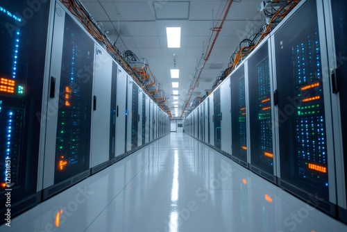 Obraz premium Server Room Corridor with Blinking Lights in Data Center