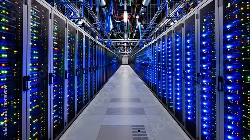 © julio, Fototapeta premium Server Room with Blue Lighted Racks