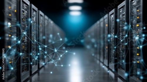Fototapeta premium Server room with network connections; dark, sleek, and filled with technology
