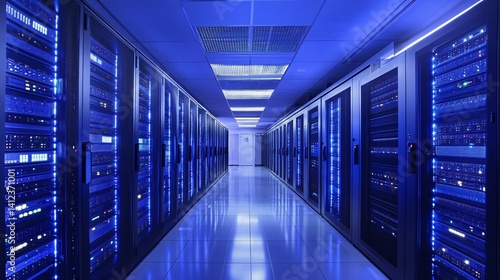 Fototapeta premium Server room with rows of computer servers illuminated in blue light.
