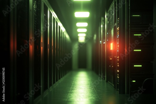 © Vision Ripple, Fototapeta premium Servers data center room with bright bokeh light going through the corridor 3D rendering, Generative AI